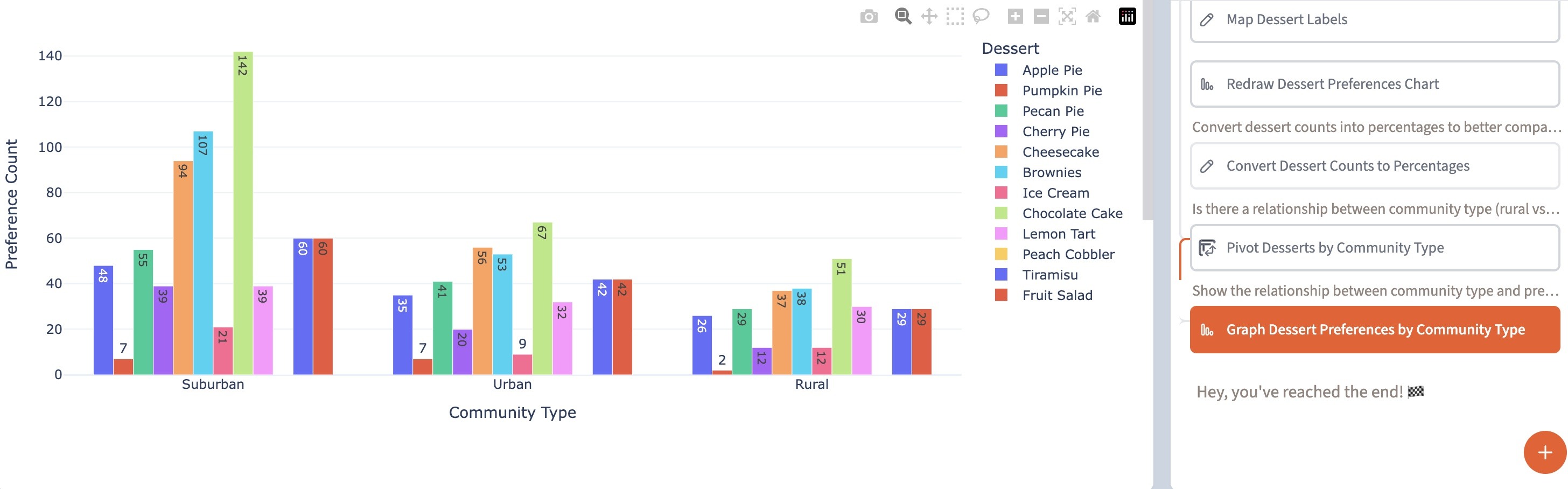 With our exploration of America’s pie and dessert preferences at Thanksgiving tables, we wrap up our Day 2. We saw just how powerful Querri can be in uncovering meaningful insights from data, even when it comes to something as deliciously complex as dessert preferences.