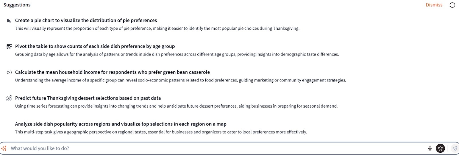 We briefly explored the Suggestions feature in our Day 1. Here it is again! Querri’s suggestion box appears when you click the What do you want to do? prompt. Querri doesn’t just provide smart analysis ideas but also offers helpful phrasing and context for your insights.