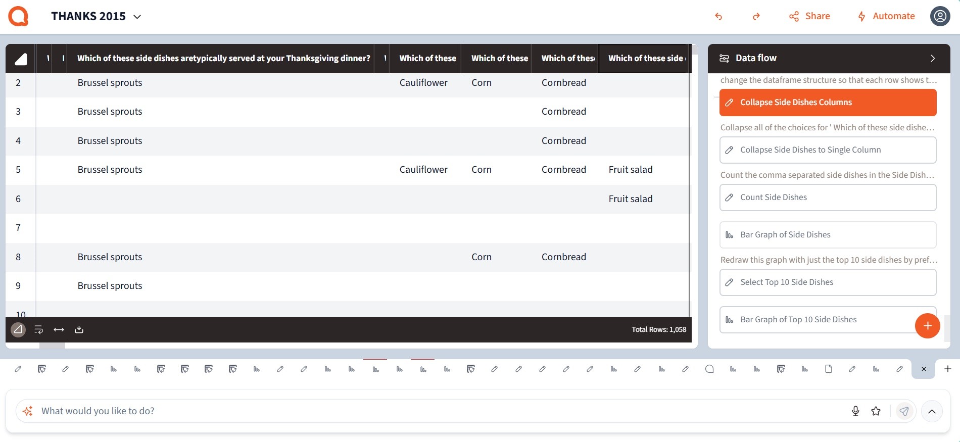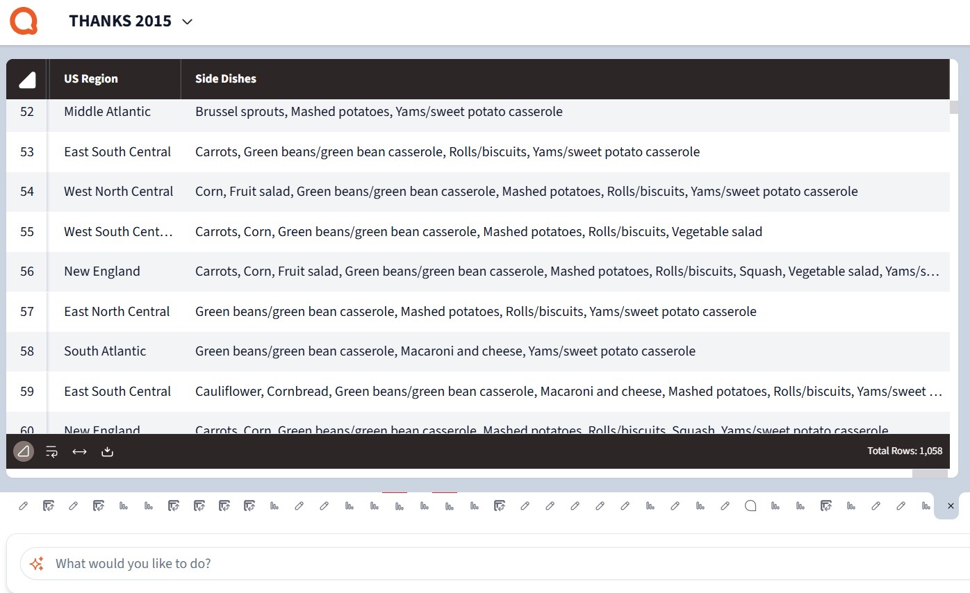 In the image below, each column represents a survey question as its header. The questionnaire asked users, "Which of these side dishes are typically served at your Thanksgiving dinner?" The survey results created multiple columns—one for each side dish option. To be able to perform a deep analysis of the side dishes, we wanted to collapse all options for each region into a single column, with comma-separated values of side dish preferences for each region. Using Querri, we seamlessly collapsed all these columns into a single column per region, with the side dish options neatly combined as comma-separated values.