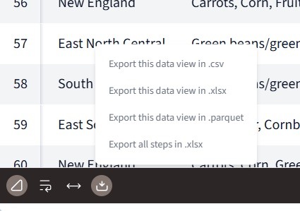 Querri makes it easy to export both your data and the steps taken to achieve it. Data can be exported in formats like .csv, .xlsx, or .parquet. The exported steps can be reused to start a new project or shared with colleagues for seamless collaboration.