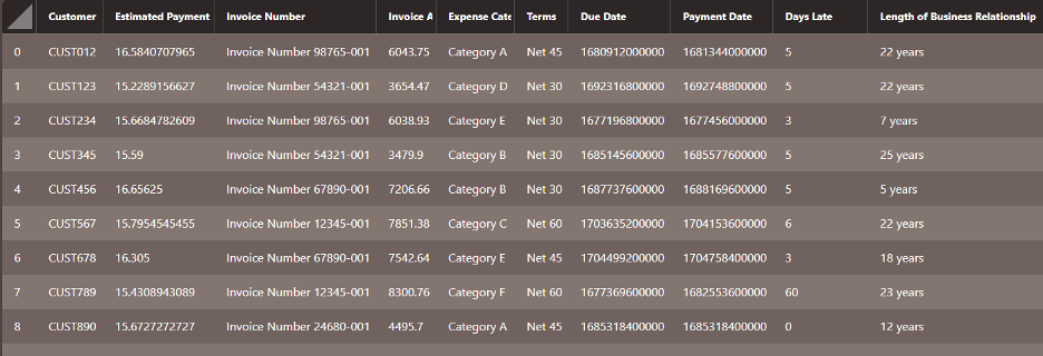 For a demonstration exercise, Querri was given a sample payment history file with 1000 rows of manufactured data, as seen here.