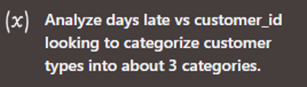 Using simple prompts, we asked Querri to analyze the data to find customer groupings associated with payment behavior. Querri took the informal language of the prompt, restructured it as shown here, and then generated a K-means clustering.