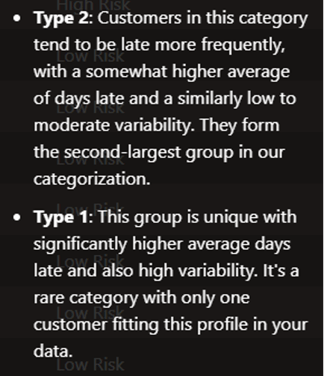 While this is a very simple example based on manufactured data, it illustrates the ability of the AI to find and understand different customer groupings, providing information that could then be used to address the different situations of the different customer groups.