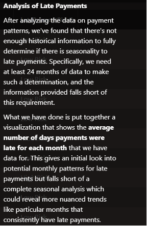 Payments can also show a lot of variation based on the time of year. While the data here was not large enough for the AI to pick up clear historical trends, it was able to provide some information. Importantly, it was also able to recognize that it did not have sufficient data to give a good answer and called that out. This can be very beneficial, as AI and people both often have a hard time giving an answer of “I don’t know,” and it’s valuable to get that response when appropriate.